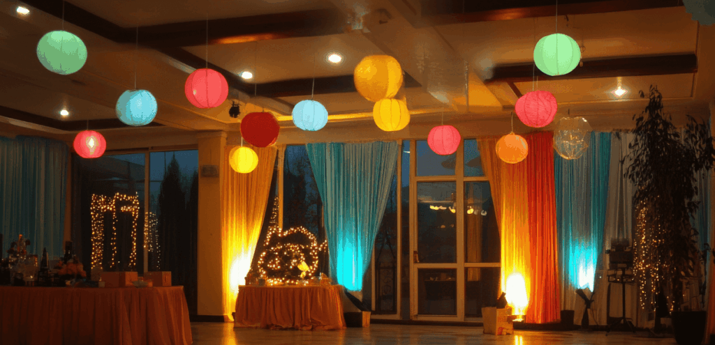 Já a iluminação decorativa possui função estética e conceitual. Ela é aplicada para valorizar elementos do espaço de eventos, como por exemplo, paredes, mesas, além de reforçar a identidade visual da marca.